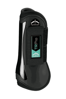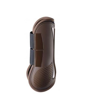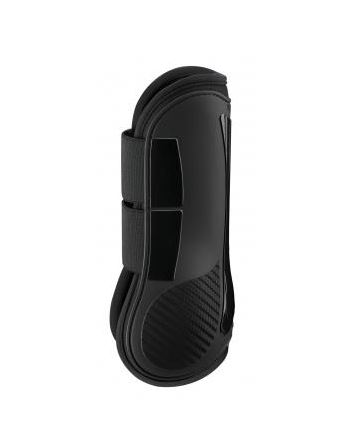 Protège-tendon ouvert sur le devant en néoprène couplé à du Lycra, avec coussin de frappe en POLYFLEX (polyuréthane élastique) équipé de deux sangles élastiques et d’une double fermeture de sécurité en velcro.