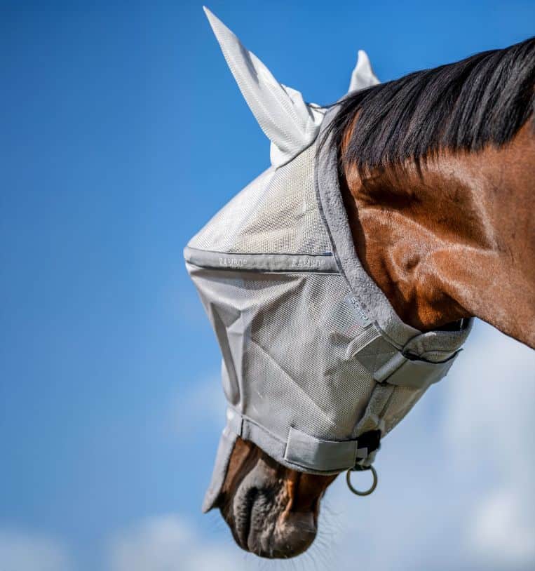 Votre cheval appréciera le temps passé au pré sans mouches et l’assurance que vous recherchez dans un masque anti-mouches.