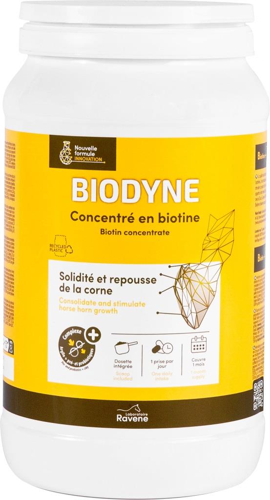 » action Biotine renforcée – le pied de votre cheval subit de nombreuses agressions externes : humidité de la litière, sols abrasifs, chocs lors du travail? Il est donc primordial d’aider votre cheval en entretenant régulièrement ses pieds. Formulé par nos experts, BIODYNE contient de la D-Biotine, de la Méthionine, du Zinc et du Cuivre favorisant la repousse de la corne et la solidité du sabot. BIODYNE apporte 20 mg de Biotine pure par jour, quantité nécessaire pour protéger le sabot efficacement. Les éléments contenus dans BIODYNE participent également à la santé et à la beauté des crins, et assurent la brillance de la robe de votre cheval. En donnant BIODYNE, vous êtes assuré d’un pied net et en bonne santé. Finis les sabots cassants et les fourchettes molles ! 1kg/env 40jours »