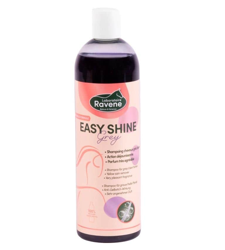 shampooing pour chevaux gris/clairs. Soleil, pluie, sueur et poussière – les crins et la robe de votre cheval sont agressés en permanence ! L’action déjaunissante de Easy Shine Grey est idéale pour les chevaux gris ou clairs ! De plus, l’épiderme du cheval est plus fin que celui de l’homme et a un pH moins acide. Il convient donc d’utiliser des produits spécifiquement formulés pour les chevaux afin de respecter leur sensibilité cutanée et de réduire les réactions dermatologiques. EASY SHINE Grey apporte propreté, rend les crins et la robe visiblement plus brillants. Il ravive les couleurs et redonne vie aux poils ternis tout en respectant leur intégrité