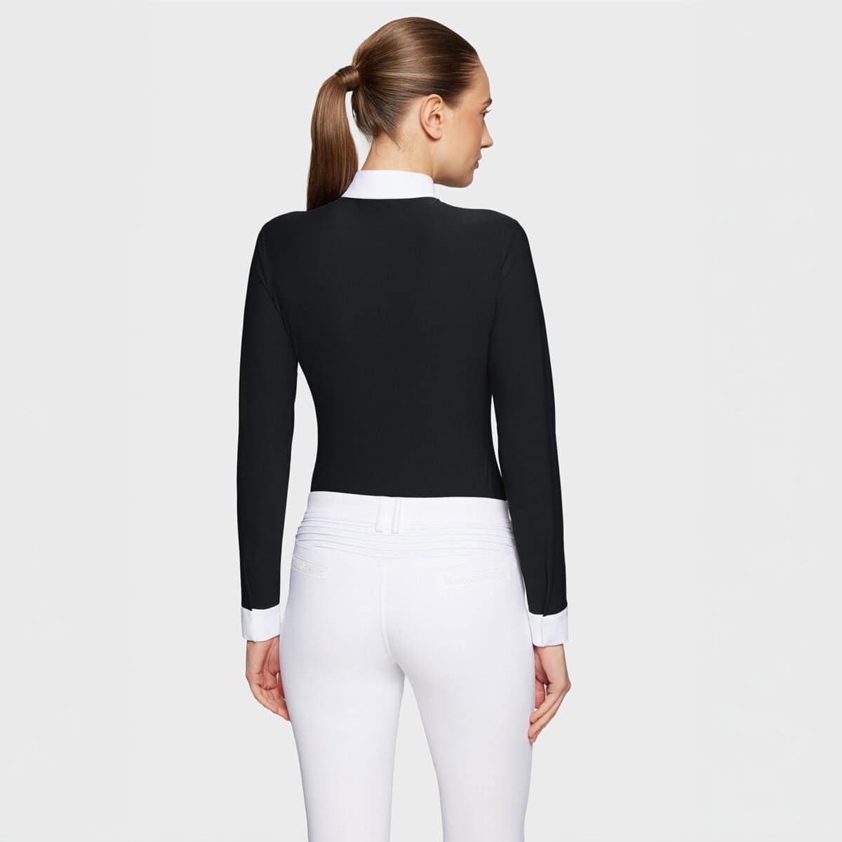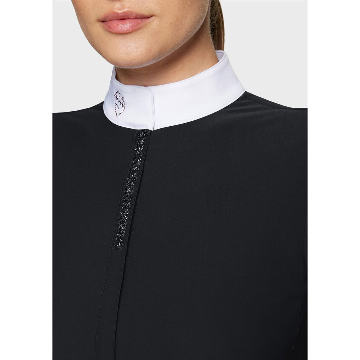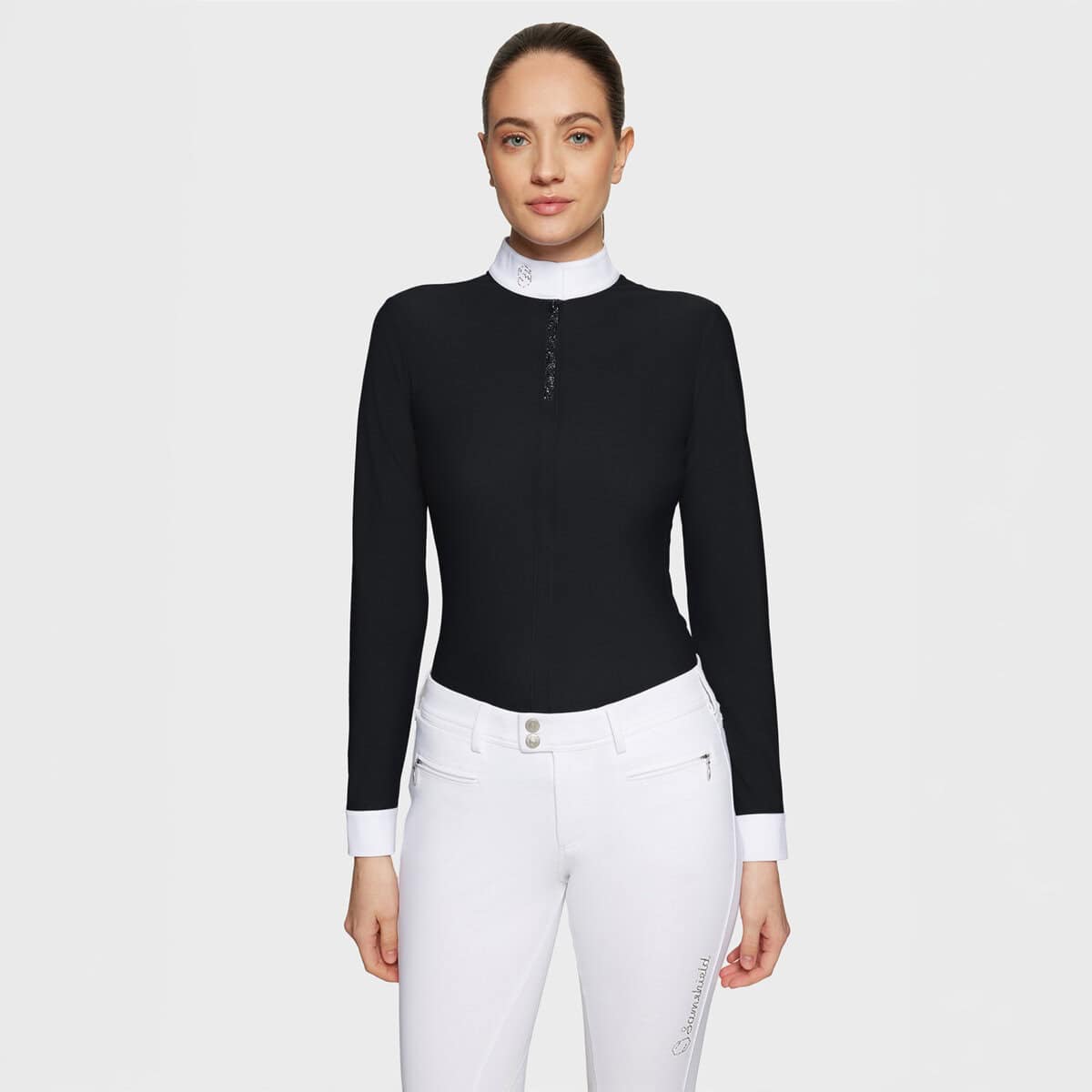 Les manches longues avec fermeture magnétique aux manchettes ajoutent praticité et style, tandis que le demi-zip invisible décoré de Swarovski ultrafine rocks et le blason Samshield crystal sur le col apportent une touche subtile de sophistication. Sobre mais luxueux, ce haut est pensé pour la cavalière qui souhaite performer avec distinction.