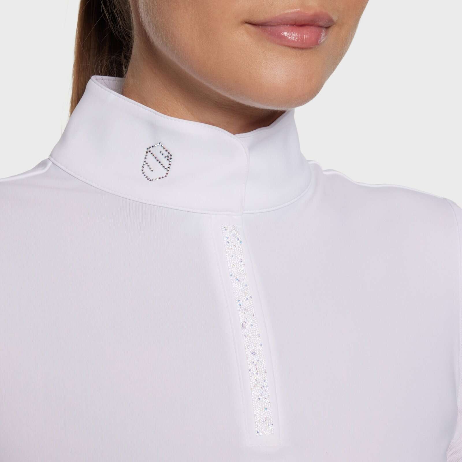 Conception sobre à manches courtes avec blason Swarovski, fermeture éclair invisible avec décoration de roches ultrafines et panneaux maillés respirants