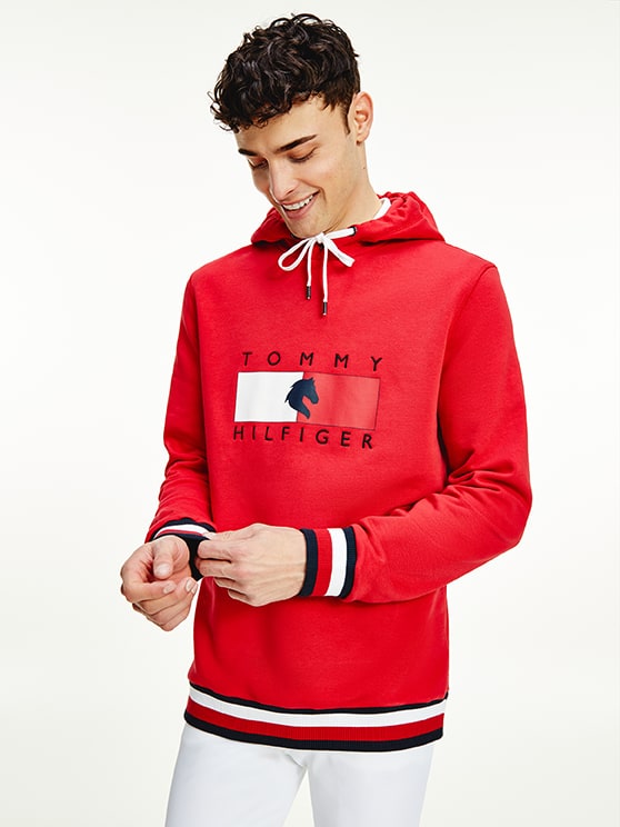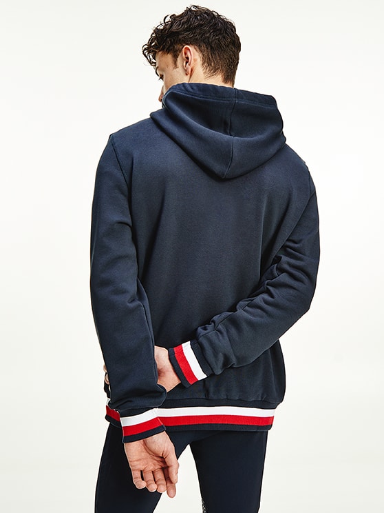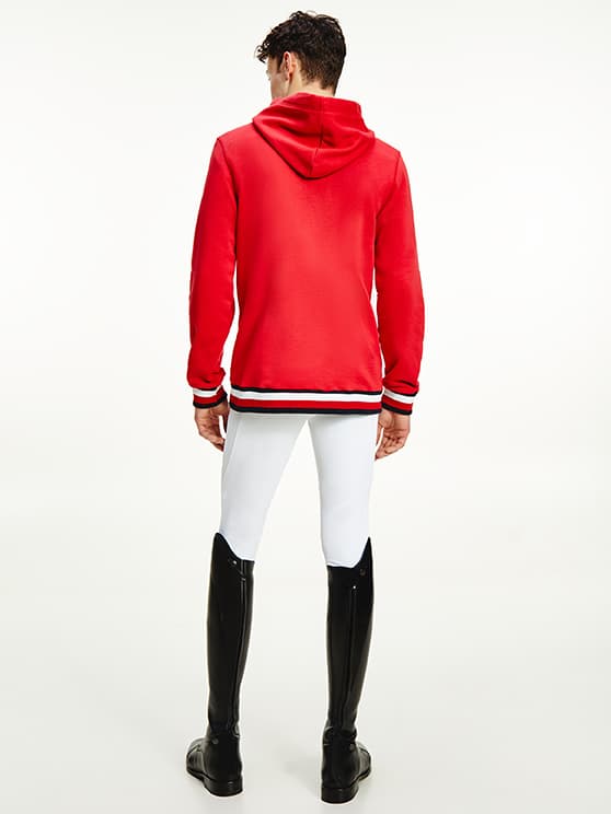 Un sweat-shirt polyvalent, de coupe normale, avec une capuche, un cordon de serrage et des extrémités de cordon en métal. Poignets et la taille dans le look caractéristique des rayures tricolores TH Global.