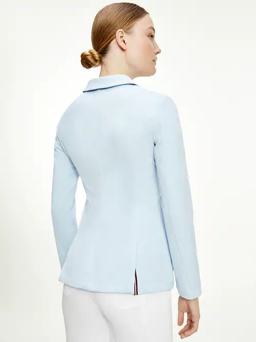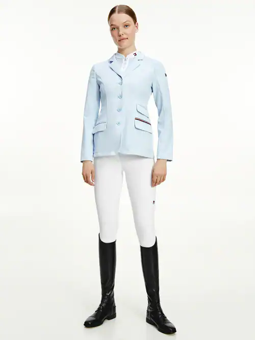 Une veste de concours sportive et élégante en stretch 4 voies avec une patte de boutonnage, une petite poche à monnaie sur le haut du corps gauche et des poches à rabat normales des deux côtés. Application cachée de la bande TH Global sur la fente arrière du dos. Logo brodé sur la manche gauche et autre bande TH Global au-dessus de la poche à rabat sur la gauche (taille du logo conforme à la FEI).