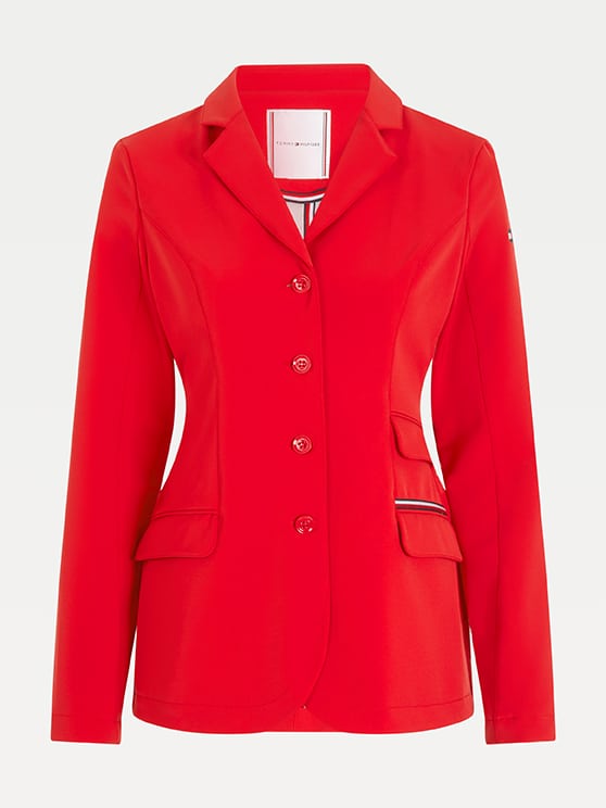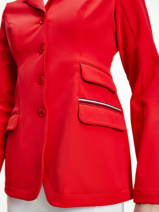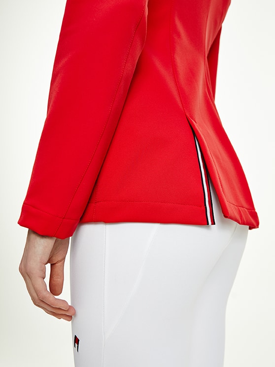 Une veste de concours sportive et élégante en stretch 4 voies avec une patte de boutonnage, une petite poche à monnaie sur le haut du corps gauche et des poches à rabat normales des deux côtés. Application cachée de la bande TH Global sur la fente arrière du dos. Logo brodé sur la manche gauche et autre bande TH Global au-dessus de la poche à rabat sur la gauche (taille du logo conforme à la FEI).