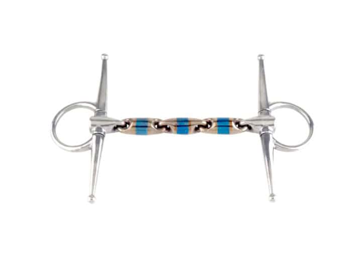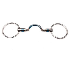 Le mors à branches Waterford de Trust possède des branches d’une longueur de 6,0 cm. Cela permet d’exercer une pression plus importante sur les joues et de faire tourner le cheval plus facilement. De plus, le mors ne peut pas être retiré de la bouche. Les anneaux auxquels sont fixées les rênes ne sont pas mobiles. Ce mors est incroyablement stable et stable dans la bouche du cheval, ce qui le rend idéal pour les chevaux qui ont des problèmes de position et de flexion. Les branches sont légèrement courbées vers l’extérieur, de sorte qu’elles n’entrent pas en contact avec le côté de la tête du cheval. Afin d’éviter toute blessure, il faut veiller à ce que le mors soit placé dans la bouche de manière à ce que les barrettes soient tournées vers l’extérieur. L’embouchure Waterford est composée de maillons individuels mobiles de couleur bleue reconnaissable. Il s’agit d’un alliage spécial qui s’oxyde au contact de l’humidité et forme une couche de rouille en surface. Celle-ci a un goût sucré pour les chevaux et stimule naturellement la production de salive. Grâce aux maillons individuels, il est pratiquement impossible pour le cheval de s’appuyer sur le mors.