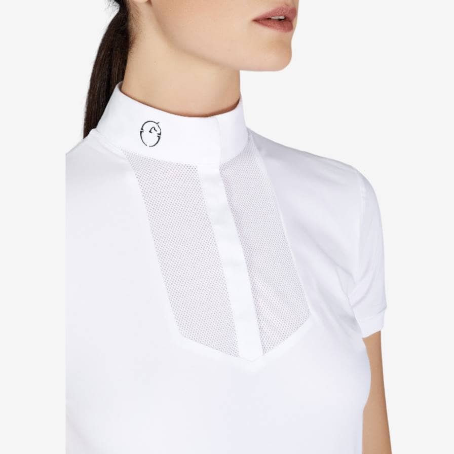 Polo de compétition pour femme en tissu technique, léger et respirant, avec plastron avant réalisé avec un dessin géométrique pour rendre le polo plus élégant et féminin. Logo Vestrum contrasté imprimé sur une manche. Manches courtes, col en popeline et boutons devant.