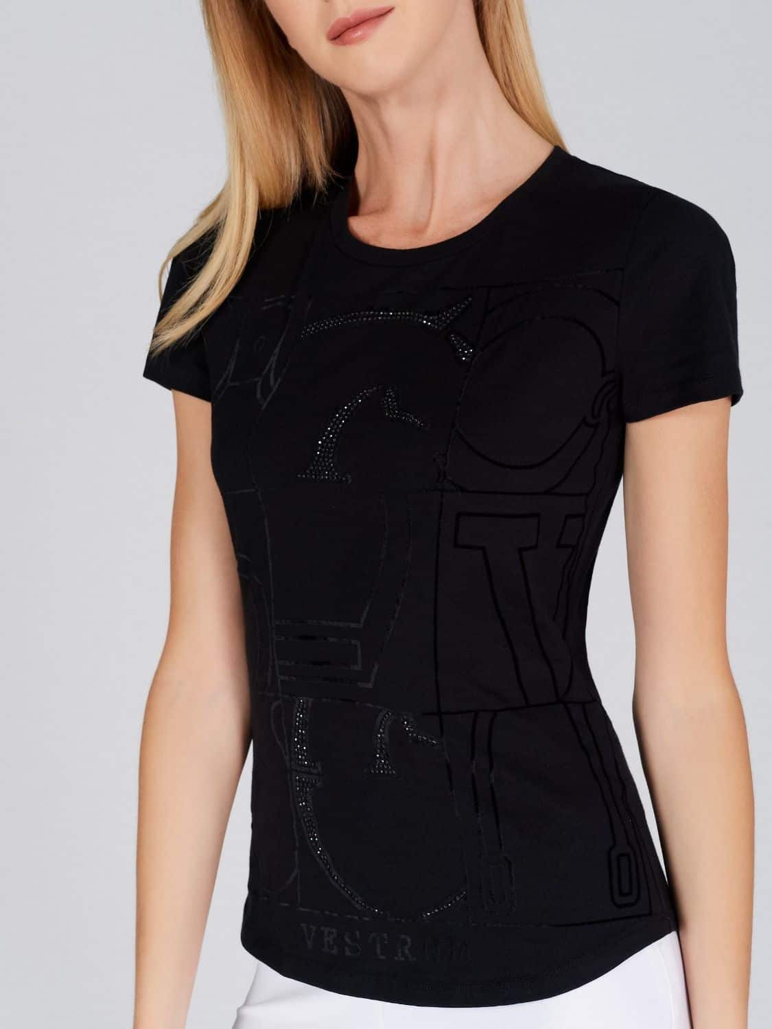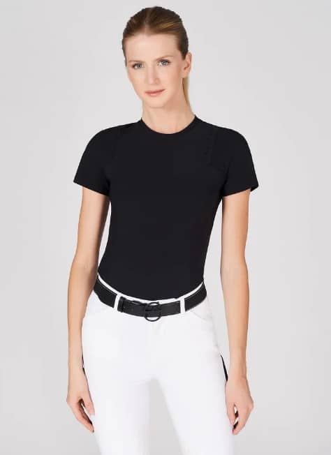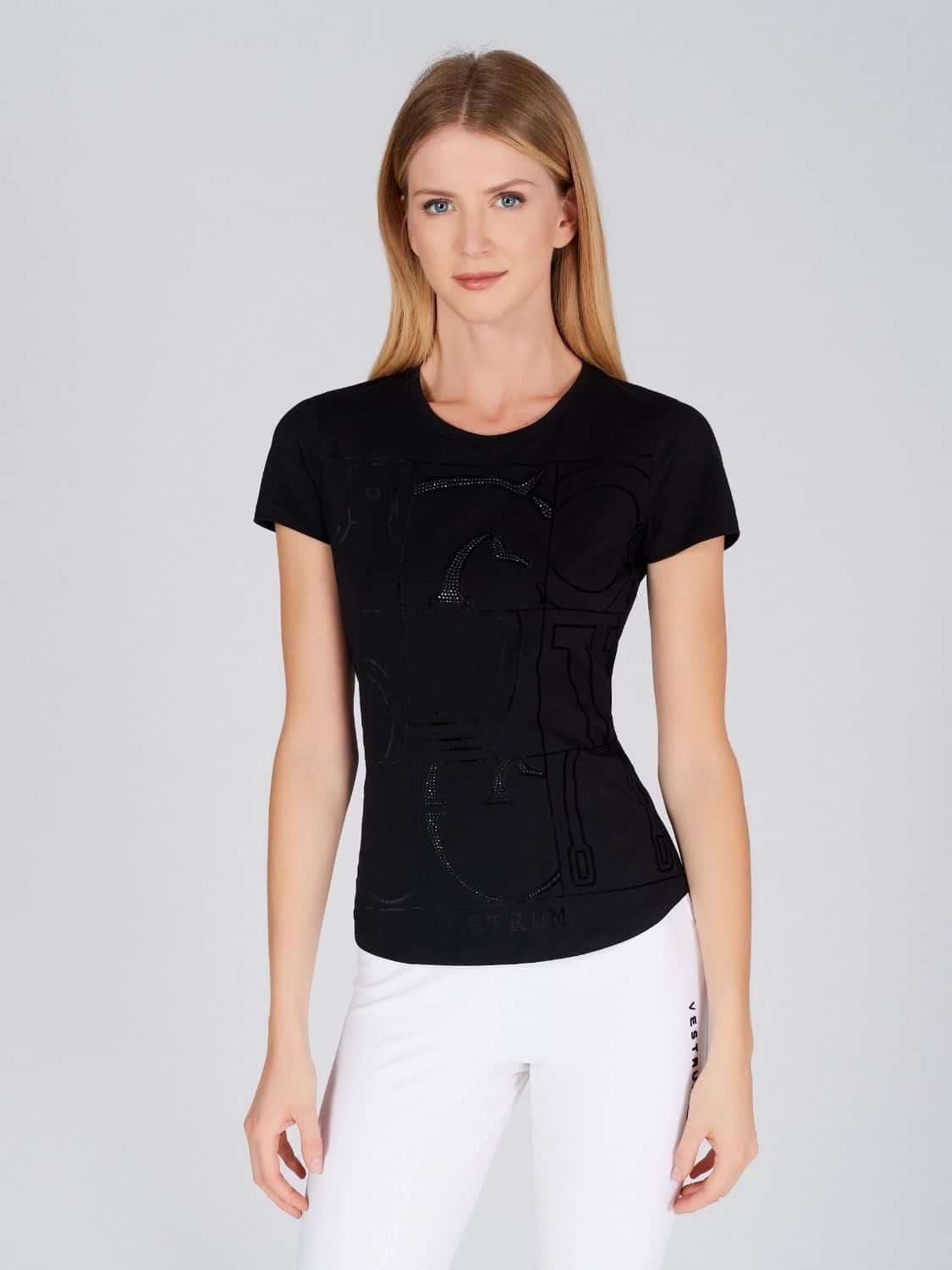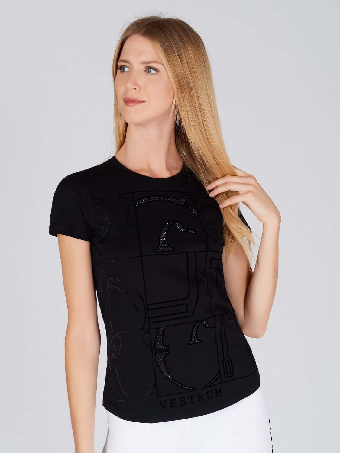 T-Shirt Vestrum Viserba pour femme à manches courtes, tissu en coton stretch. Imprimé équestre devant aux couleurs ton sur ton. 100% Fabriqué en Italie.
