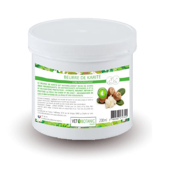 Le beurre de karité est un soin externe 100% pur issu des fruits de l’arbre par pression. Il est naturellement protecteur et apaise les irritations de l’épiderme et des coussinets. Sa richesse naturelle en principes actifs (vit A et E, phytostérol, latex…) lui donne naturellement des vertus protectrices et anti-oxydantes pour l’épiderme.