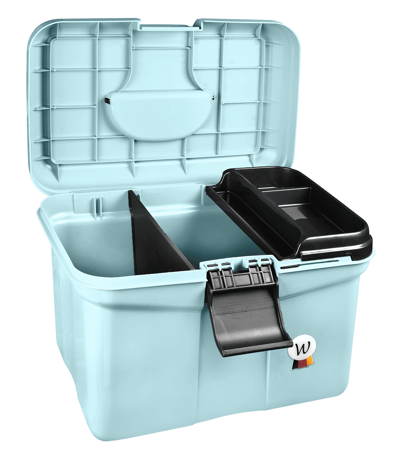 Boîte de pansage de qualité supérieure en plastique recyclé. Le compagnon idéal dans l’écurie et en compétition. Elle se caractérise par une poignée escamotable, une fermeture à cliquet verrouillable, une paroi de séparation réglable sur deux niveaux, un compartiment extensible pour les petites pièces et un poids plume !