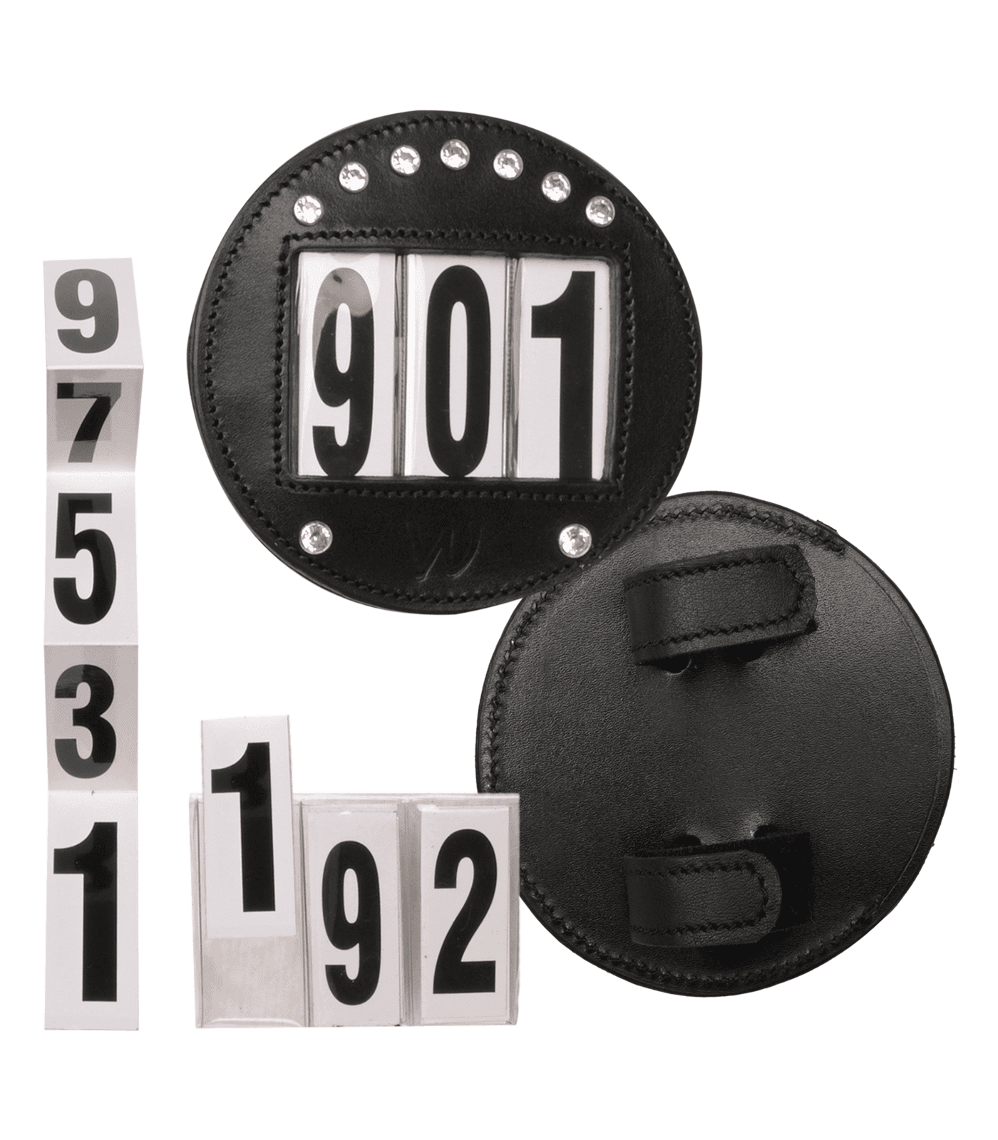 Numéros de tête en cuir souple orné de strass. Remplacement facile des chiffres. Réglable de 1 à 999. Fixation simple à la bride par des fermetures velcro. La paire