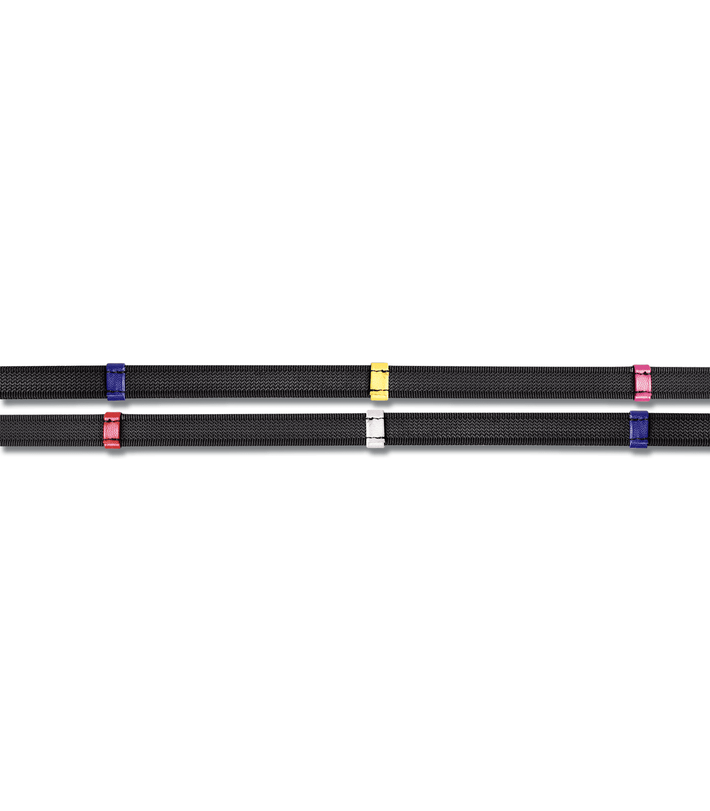 Avec revêtement en caoutchouc ouvragé. Avec arrêtoir à différentes couleurs pour un réglage facilité de la longueur des rênes Avec arrêtoir.